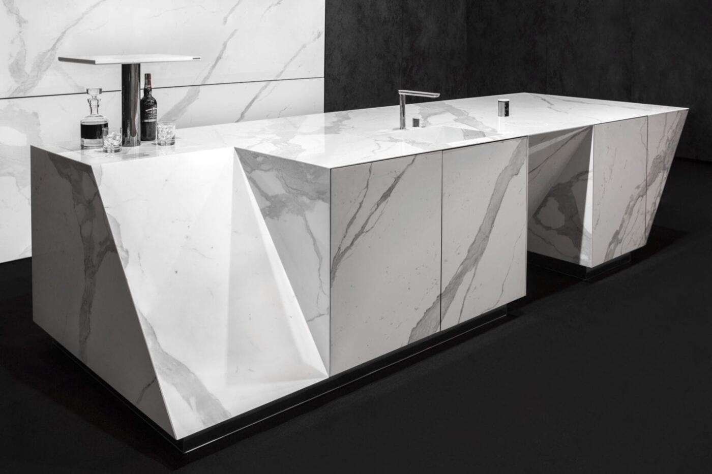 Tworzywem, które posłużyło projektantom do wykonania wyspy MODULTOP są spieki kwarcowe włoskiej marki Laminam. Materiał przyszłości, który perfekcyjnie łączy walory funkcjonalne i estetyczne. W pełni naturalne, ultracienkie płyty dostępne są w niespotykanym formacie nawet 160 x 320 cm. Spieki kwarcowe są niezwykle trwałe i bardziej odporne na uszkodzenia niż naturalny kamień. Potrafią wiernie odwzorowywać różne gatunki kamienia, drewna i metalu zarówno pod względem rysunku, jak i faktury, a zespół projektantów włoskiej marki nieustannie poszerza portfolio produktów o nowe wzory. Zastosowanie płyt Laminam pozwala na personalizacje wyspy MODULTOP zgodnie z indywidualnymi oczekiwaniami klientów i w sposób dostosowany do charakteru wnętrz ich domów.