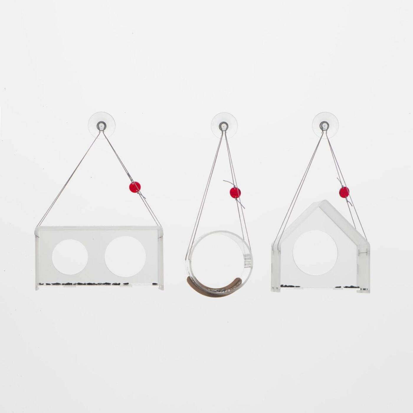 Wrażenie lekkości wzmacnia zawieszenie bezpośrednio na szybie okna za pomocą silikonowej przyssawki na delikatnych lineczkach. Dna karmników dla lepszych efektów obserwacyjnych wykonane są z przeźroczystej plexi. Czerwony element na lince poza estetyczną pełni również funkcję drogowskazu, uwaga tu jest jedzenie! tak jak jarzębina która swoim kolorem wabi ptaki zimą. Karmniki przykleja się do okien, aby wprost z łóżka,z sypialni czy znad kuchennego stołu obserwować ptaki.