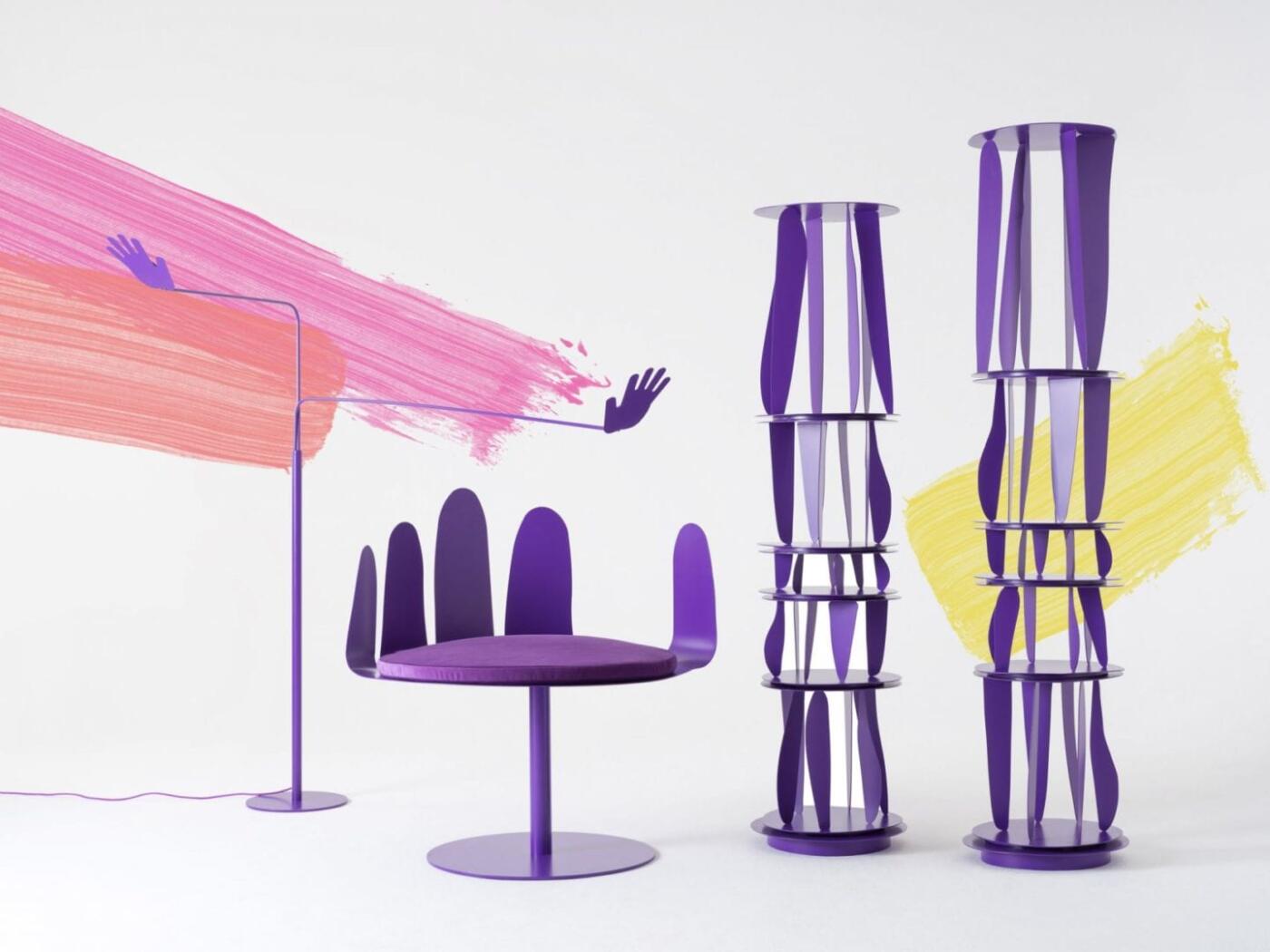 Purpurowe krzesło autorstwa firmy Crosby Studios, w którym dłoń działa jak siedzenie, a palce uginają się tworząc oparcie, jest główną atrakcją serii mebli i akcesoriów. Kolejny eksponat – kudłate krzesło, w całości pokryto futrzaną tapicerką, wyglądem zbliżonej do ponadczasowej zabawki „Furby”. Seria fioletowych stolików w multi-funkcjonalny sposób odnajdzie zastosowanie zarówno jako stolik kawowy, stołek, czy jak zapewniają projektanci – ozdoba, która wpisze się w każde wnętrze. Więcej kształtów dłoni pojawia się w szeregu obszernej oprawy oświetleniowej, która rozciąga się wzdłuż ścian, pozwalając utrzymać niezwykle wyważoną spójność projektową. Iluminacje nawiązują do francuskiej lampki-pająka autorstwa Serge’a Mouilla, sprzedawanej raz do roku w ilości tysiąca egzemplarzy na cały świat. Giętki wieszak na ubrania, podąża za obrysem dłoni pozwalając na powieszenie odzieży „między palcami” konstrukcji.