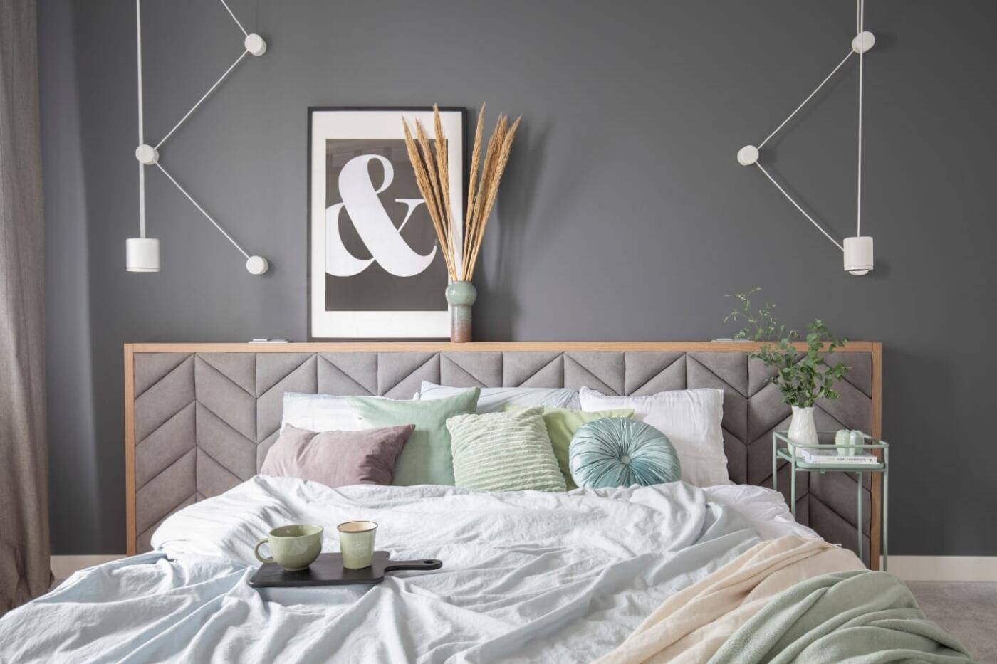 Na piętro, do części prywatnej prowadzą podświetlane schody o lekkiej konstrukcji. Na tej kondygnacji ulokowano sypialnię właścicieli, dwie łazienki, przestronną garderobę i gabinet. W sypialni pierwsze skrzypce gra drewniane łóżko z szerokim, tapicerowanym we wzór jodełki zagłówkiem. Ciekawym akcentem dekoracyjnym, konsekwentnie nawiązującym do innych elementów wystroju są lampki nocne na długich, sznurkowych przewodach.