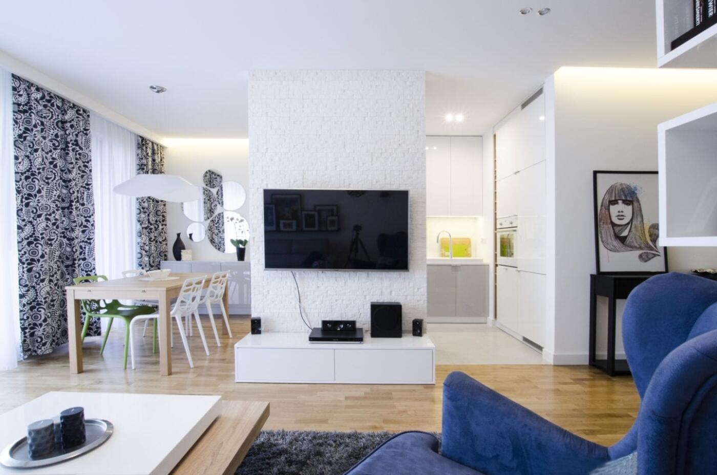 Jednym z najważniejszych elementów są różne rodzaje oświetlenia dające spectrum możliwości przy tworzeniu odpowiedniego klimatu w mieszkaniu. Dzięki temu oraz przemyślanym założeniom funkcjonalnym praktycznie każda ze ścian stanowi odrębny dekoracyjny element przykuwający uwagę odbiorcy. Tuż po wejściu do mieszkania główną rolę odgrywa wyraźnie zaakcentowana ściana i duże lustro, które odbija obraz dalszego planu przestronnego salonu i miękkiego światła zza dużych okien. Mijamy niewielką garderobę i tuż za rogiem znajduje się praktyczna konsola z nowoczesną grafiką. W salonie bardzo charakterystycznymi elementami wyposażenia jest niebieski fotel oraz regał o nieregularnym kształcie, w którym prócz książek znajdują się liczne zamknięte schowki.