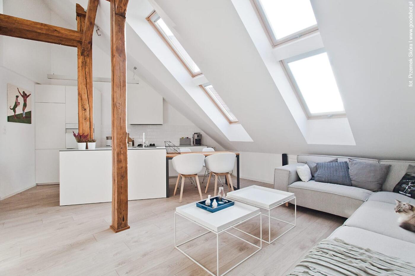 Podstawą do wykreowania przestrzeni i klimatu było zastosowanie dużej ilości okien połaciowych, dzięki nim wnętrze jest doświetlone, wygląda przytulnie i zachęcająco. Wnętrze sprawia wrażenie bardzo przestronnego, dzięki zachowaniu oryginalnej wysokości. Wykorzystano istniejące elementy więźby dachowej oraz odkryto istniejącą cegłę. Do wykonania drewnianych blatów i stołów wykorzystano stare drewno rozbiórkowe. Elementami wyposażenia wnętrz są głównie jasne, proste meble, które za zadanie maja wtopić się w tło. Aranżacja mieszkania wzbogacona jest o dodatki, które dodają charakteru-obrazy, fotografie w ramach.