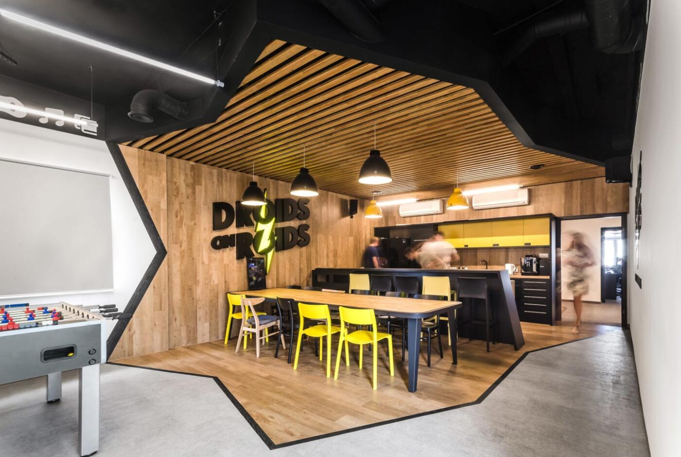 Team Droids On Roids spędza ze sobą bardzo dużo czasu nie tylko podczas pracy nad projektami. W 2016 roku zespół wyjechał na miesięczne pracujące wakacje na Bali. Okazało się, że programiści mają kilka bardzo ważnych dla siebie rytuałów związanych z celebrowaniem publikacji nowych projektów czy wspólnymi seansami filmowymi. Potrzebowali więc miejsca, które sprawdzi się zarówno podczas codziennej pracy, jak i w trakcie Eventów po godzinach. Stąd też dwie różne funkcje kuchni oraz playroomu połączono w jednym pomieszczeniu tworząc dużą wielofunkcyjną przestrzeń, który ciągle tętni życiem. Dynamicznym podziałem strefy kuchennej projektanci po raz kolejny nawiązali do skosów z motywu błyskawicy.