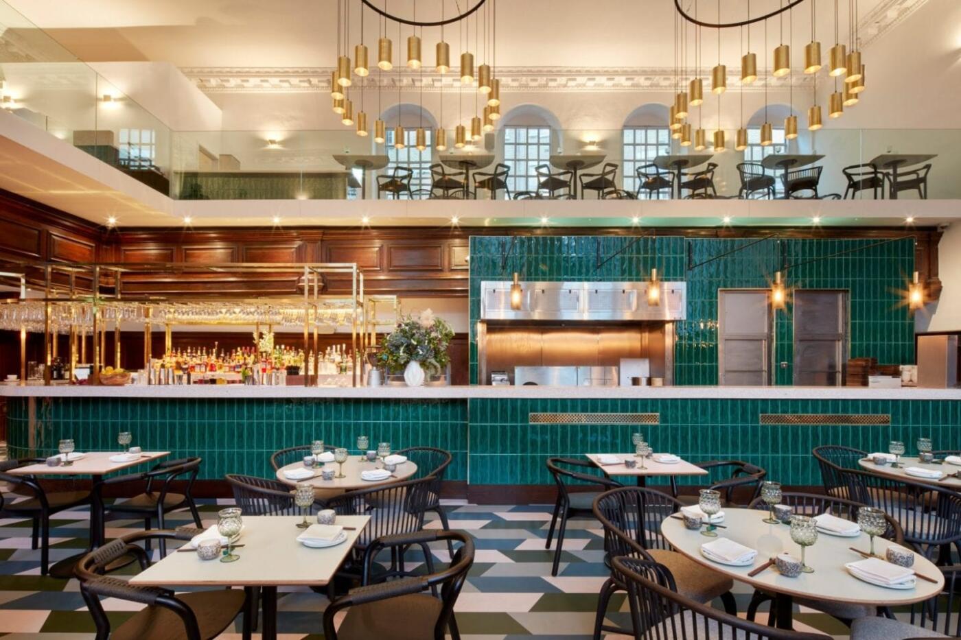 Dwupoziomowa restauracja inspirowana latami sześćdziesiątymi, łączy styl retro ze współczesnymi trendami designerskimi, zabierając nas w podróż do starej, chińskiej herbaciarni. Wielkie okiennice rozświetlają szlachetne wnętrza budynku. Niezwykle cięzko odwrócić wzrok od bogatego, geometrycznego wzornictwa i złotych żyrandoli nadających poczucie precyzyjnie wyważonej elegancji.