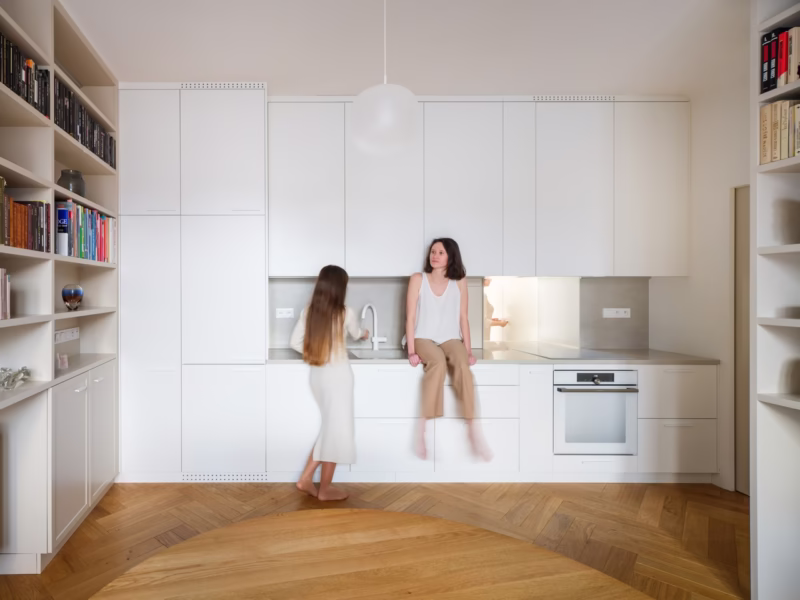 Statystyczne czeskie mieszkanie ma 86,7 metra kwadratowego. Tyle mówią dane ze spisu powszechnego z 2021 roku. Zazwyczaj mieści 2,9 pokoju plus kuchnię. Reszta to korytarze, łazienki, toalety – przestrzenie, przez które się przechodzi. Ale co by było, gdyby potraktować każdy centymetr mieszkania jak równoprawną przestrzeń do życia? Architekci z pracowni No Architects postanowili to sprawdzić.