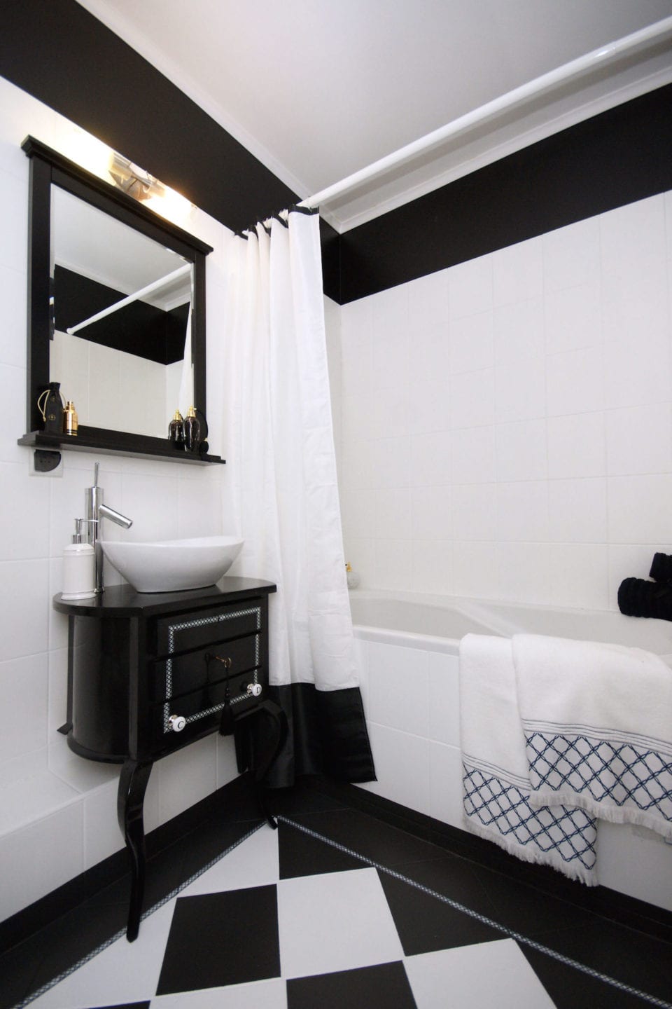 Autorki bloga Pani to Potrafi, Beata Łańcuchowska i Anna Drozd, postanowiły z brzoskwiniowo-zielonej, przestarzałej łazienki we Wrocławiu wyczarować czarno-biały pokój kąpielowy. Głównym elementem dekoracyjnym miała stać się czarno-biała podłoga, ozdobiona bordą z drobnym geometrycznym wzorem. Do tego jeszcze szafka umywalkowa, stworzona z urokliwego, ale nadszarpniętego zębem czasu „antyczku”, znalezionego w jednym z antykwariatów oraz pasujące do charakteru wnętrza dodatki.